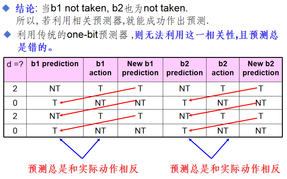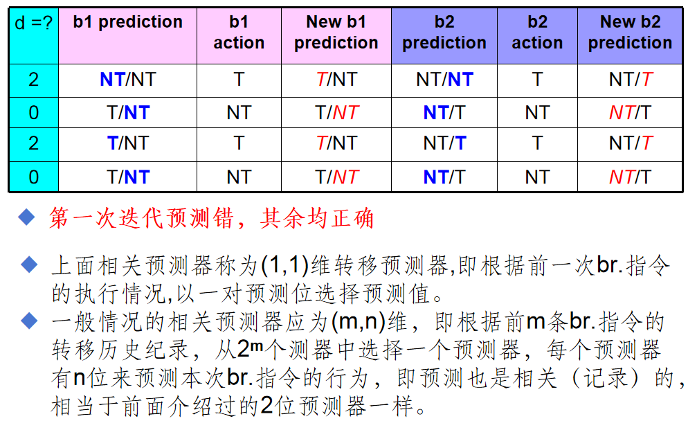 设2-bit相关预测器的第1位是上次转移不成功时的本次预测;第2位是上次转移成功时的本次预测;表中预测初值为NT/NT(下划线表示本次预测),用NT(=branch not taken)和T(=branch taken)表示转移不成功(不发生)和成功(发生)。