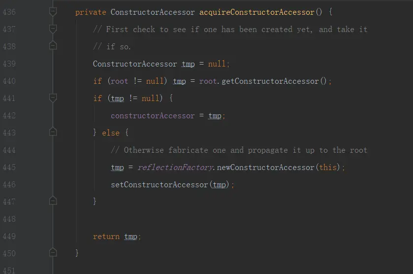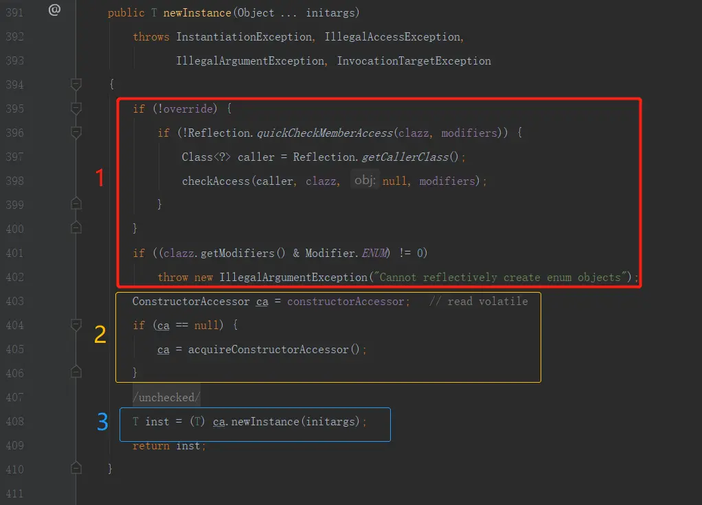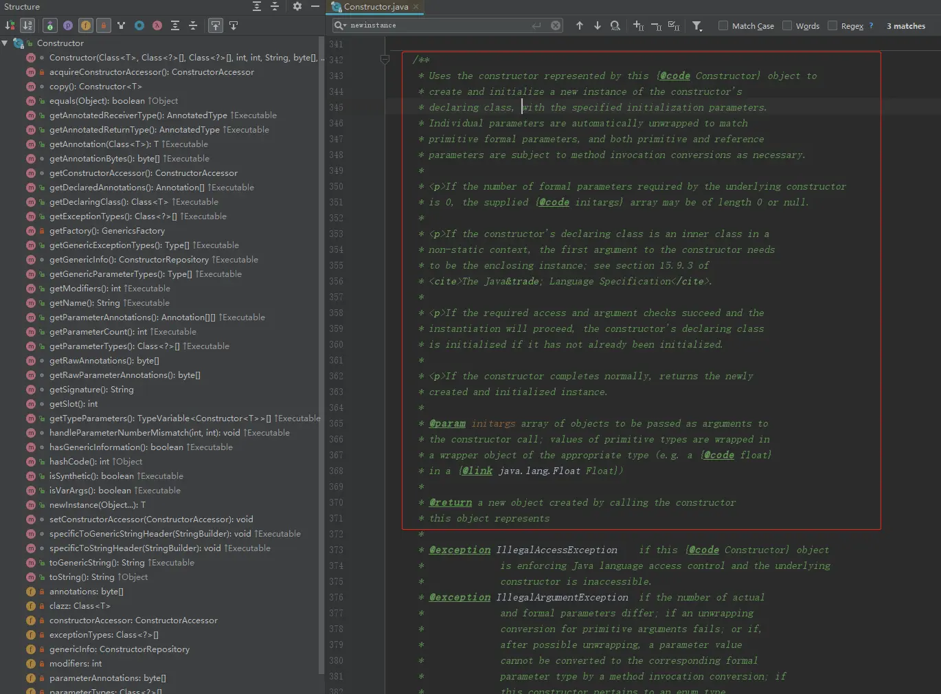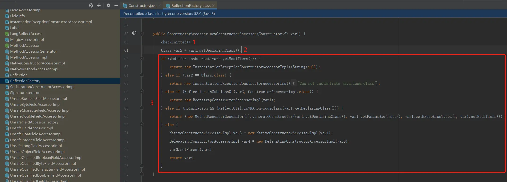 首先我们根据 jdk 提供的注释知道 newInstance 可以根据参数进行初始化并返回实例,想要获取实例必须要获取到构造函数的声明类 ConstructorAccessor ,随后我们就深入分析了 ConstructorAccessor 。