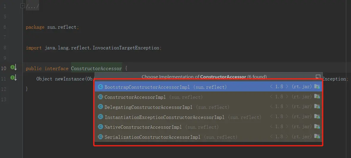构造函数声明类 ConstructorAccessor 是一个接口,如下图所示: