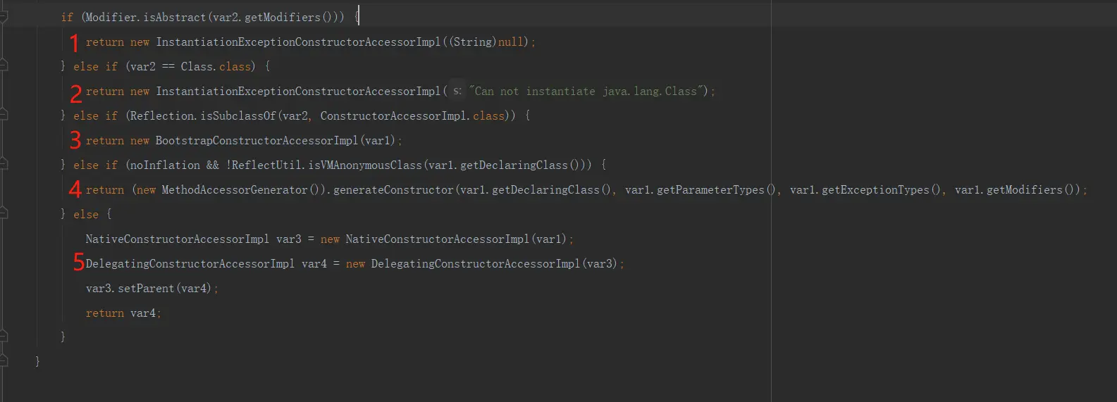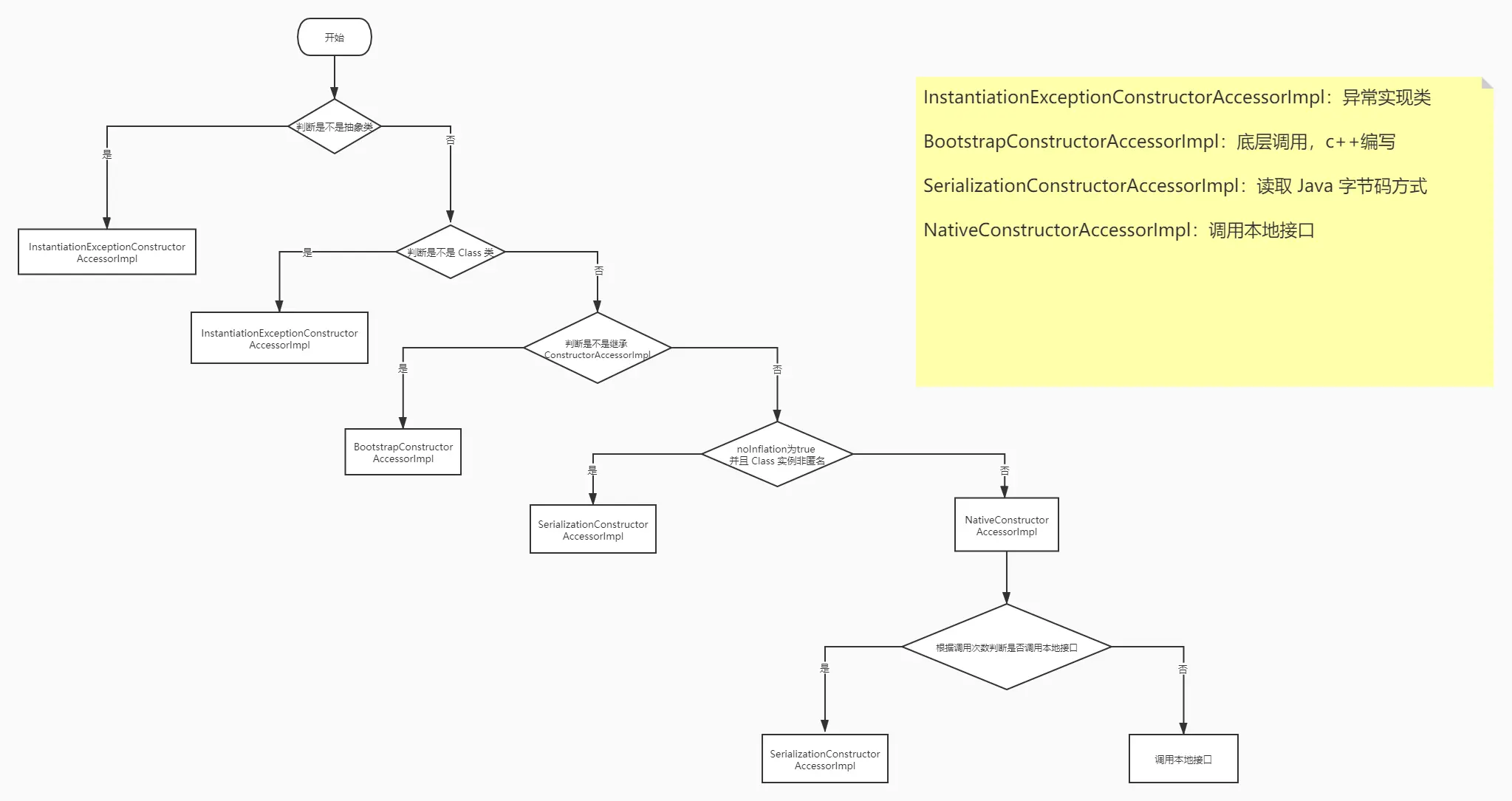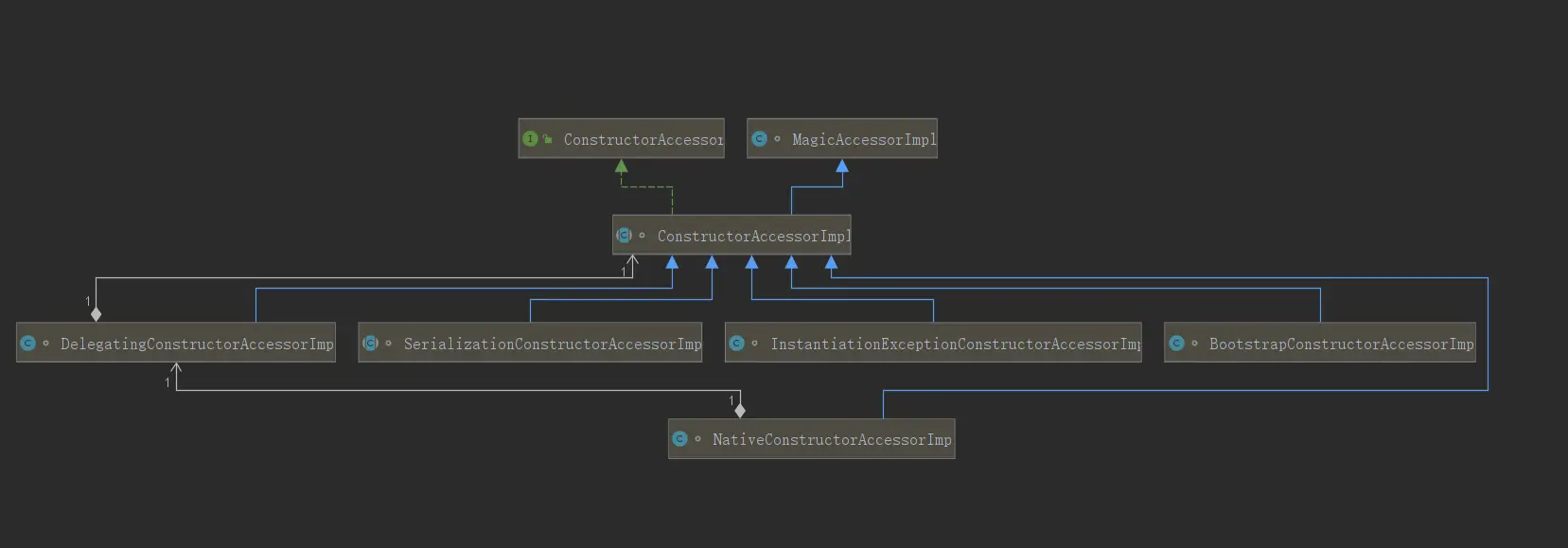 BootstrapConstructorAccessorImpl:当需要创建的 Class 实例和 ConstructorAccessorImpl 是父子关系,就要返回 BootstrapConstructorAccessorImpl,调用的是底层的方法,通过 C++ 编写。