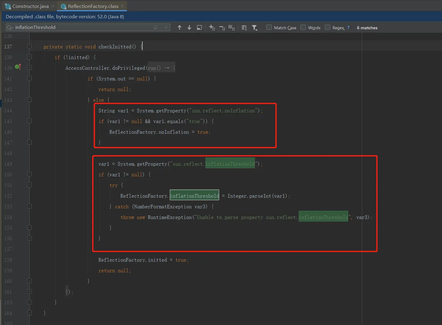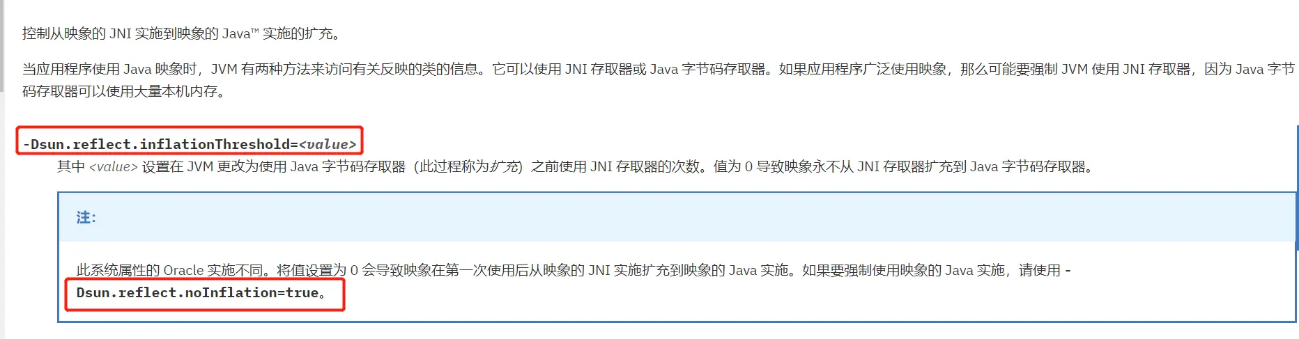猜的差不多,JVM 有两种方法来访问有关反射的类的信息,可以使用 JNI 读取器或者 Java 字节码存取器。inflationThreshold 是使用 JNI 存取器的次数,值为 0 表示永不从 JNI 存取器读取。如果想强制使用 Java 字节码存取器,可以设置 noInflation 为 true。