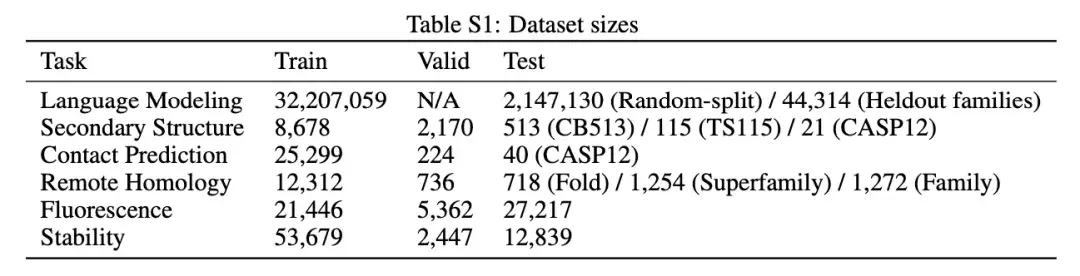 TAPE 使用 Pfam(3100 万数据)作为预训练的训练集,这里面的数据根据进化关系被聚类成不同的家族。同时,在下游任务中,作者使用了 5 个数据集(对应前面说的 3 类下游任务),数据集大小如下表所示。