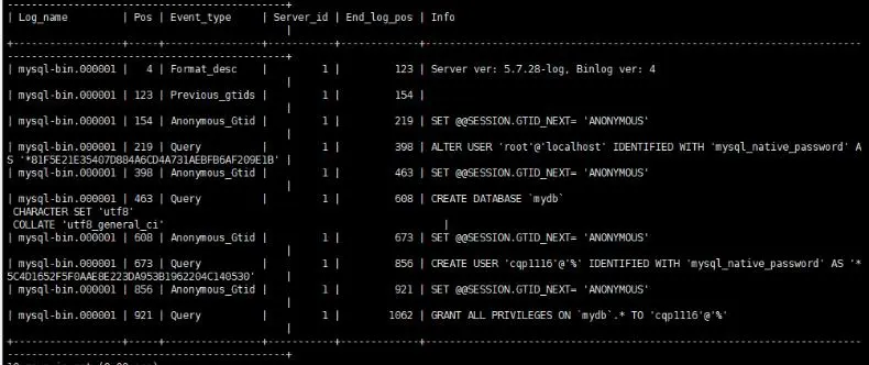 #比较清晰的查看出当前日志中存放的内容,包含开始节点,结束节点。通过binlog日志文件查看日志信息