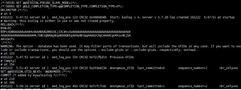 --stop-position=463 #结束点/*!50530 SET @@SESSION.PSEUDO_SLAVE_MODE=1*/;/*!50003 SET @OLD_COMPLETION_TYPE=@@COMPLETION_TYPE,COMPLETION_TYPE=0*/;DELIMITER /*!*/;# at 4#191222 5:47:51 server id 1 end_log_pos 123 CRC32 0x4669d9db Start: binlog v 4, server v 5.7.28-log created 191222 5:47:51 at startup# Warning: this binlog is either in use or was not closed properly.ROLLBACK/*!*/;BINLOG 'B5P+XQ8BAAAAdwAAAHsAAAABAAQANS43LjI4LWxvZwAAAAAAAAAAAAAAAAAAAAAAAAAAAAAAAAAAAAAAAAAAAAAAAAAAAAAHk/5dEzgNAAgAEgAEBAQEEgAAXwAEGggAAAAICAgCAAAACgoKKioAEjQAAdvZaUY='/*!*/;WARNING: The option --database has been used. It may filter parts of transactions, but will include the GTIDs in any case. If you want to exclude or include transactions, you should use the options --exclude-gtids or --include-gtids, respectively, instead.# at 123#191222 5:47:51 server id 1 end_log_pos 154 CRC32 0x721fbd14 Previous-GTIDs# [empty]# at 154#191222 5:51:43 server id 1 end_log_pos 219 CRC32 0x293ed234 Anonymous_GTID last_committed=0 sequence_number=1 rbr_only=noSET @@SESSION.GTID_NEXT= 'ANONYMOUS'/*!*/;COMMIT /* added by mysqlbinlog *//*!*/;
