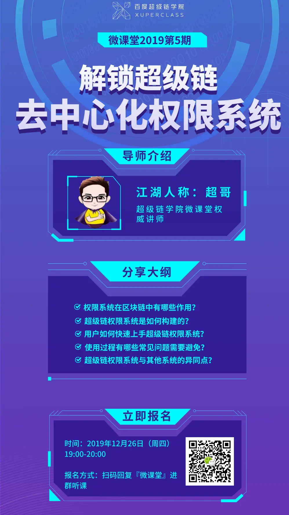 #微课堂预告# 百度超级链 2019-12-24 70 阅读1分钟 一般的账户与权限系统只能适用于联盟链场景?如何实现去中心化的权限系统?又如何使权限系统简单易上手? 本期超级链线上微课堂,将为你揭秘超级链去中心化权限系统的实现方式,操作过程中的常见问题,以及与其他系统的异同点。 【时间】:12月26日,晚7点 【地点】:超级链技术社群,在线直播 本周四不见不散哟。