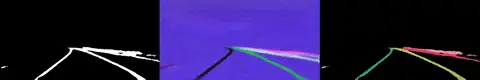 后处理包括获取两个模型输出,并将它们组合起来,得到一个具有不同颜色的图像。在合并后的图像中,我们可以使用颜色阈值来只看到特定颜色的像素,因此我们可以选择一次只显示一条泳道。对于这个项目,只有直接的左车道和右车道标记是相关的,所以颜色阈值只应用于使这两个可见。对于每个相关的车道,我们可以应用自顶向下的图像变换,以更好地在笛卡尔平面上将车道可视化为曲线。