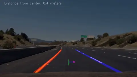 有了描述车道线的两条曲线,我们就可以计算车道的中心,假设它是两条直线的中点。我们还假设图像的中心与汽车的中心对齐。知道了汽车中心和车道中心的位置,我们就可以计算出偏离车道中心的距离。这个偏差将被用作我们试图最小化的误差。这个距离的原始计算使用像素坐标作为我们的点。在美国,高速公路的车道标志间距为3.7米。利用这些信息,我们可以将距离测量从像素单位转换为米。这个到中心的距离(以米为单位)将是控制器的输入,它将控制汽车并使其保持在车道的中心。