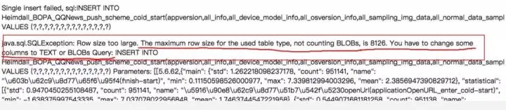 接着根据业务提供的具体SQL,appversion、datadata、elt_stamp、id这几个非大字段,也并没有超过限制,mediumblob类型字段最大可存储16M,业务的数据远远没有达到这个量级。按照报错的提示把 appversion、datadata、elt_stamp、id这几个非大字段均改成blob类型,还是无法解决(根据之前的分析,必然不是问题的根源)。