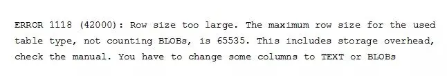 Every table (regardless of storage engine) has a maximum row size of 65,535 bytes. Storage engines may place additional constraints on this limit, reducing the effective maximum row size.