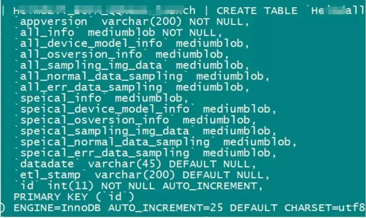 相信对于这类报错大家一定遇到过很多次,“数据大”也是生产过程中绕不开的一个话题。这里的数据“大”,远不止存储空间占用多,其中也包括了单个(表)字段存储多、大,数据留存时间长,数据冗余多,冷热数据不明显导致的体量大,访问峰值随着热点变化明显,逻辑处理复杂导致数据存储压力放大等等。回到这个报错的问题上来,我们先来看一下这个表的结构: