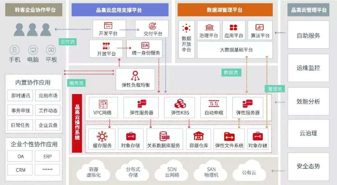 自2008年启动云产品研发至今,品高云用11年的时间悉心打造国产全栈云产品组合,最新版本的V9.0产品体系已覆盖从IaaS基础设施层、PaaS平台层、DaaS数据层到SaaS软件层;从开发、部署到交付、运维、运营;从iOS、Android、Web端到PC桌面版等各个层面和全生命周期,为客户提供全方位的云服务解决方案。