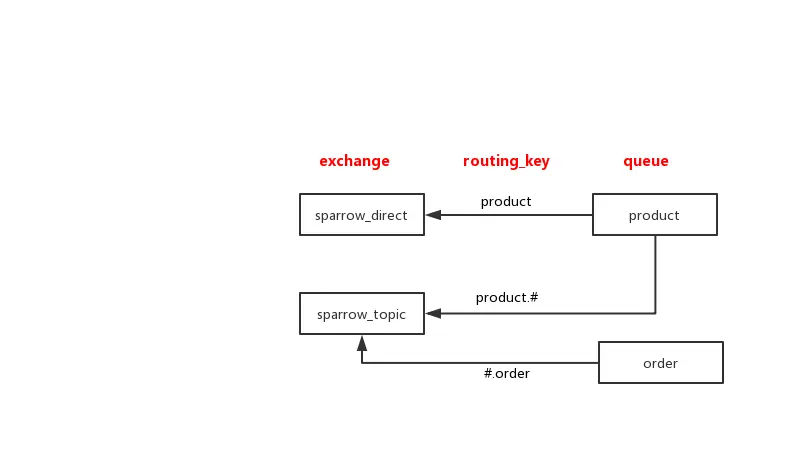 例如下图,发消息时exchange=sparrow_topic, routing_key=product.order,那么product和order队列都会收到该消息