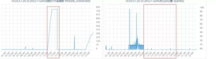 (2)查看监控信息,发现在连接数打满的时间点前并没有访问量突增的趋势,同时通过检查告警信息并没有发现有注入工单;