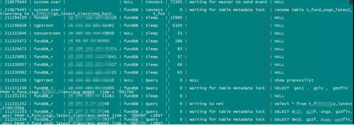 大量的请求都是在“Waiting for table metadata lock”,可以分成三类请求: