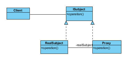 Proxy相当于房产中介, RealSubject就是卖房者,Client就是买房者, operation方法就是委托的内容,Proxy与 RealSubject共同实现一个接口,以表示他们的操作一致。