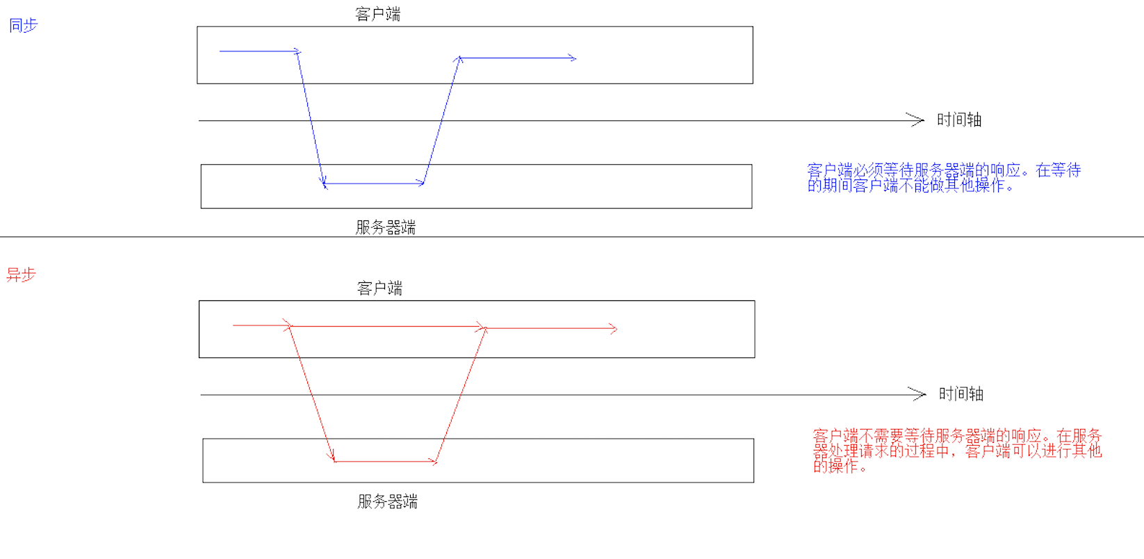 - 同步:客户端必须等待服务器端的响应。在等待的期间客户端不能做其他操作。