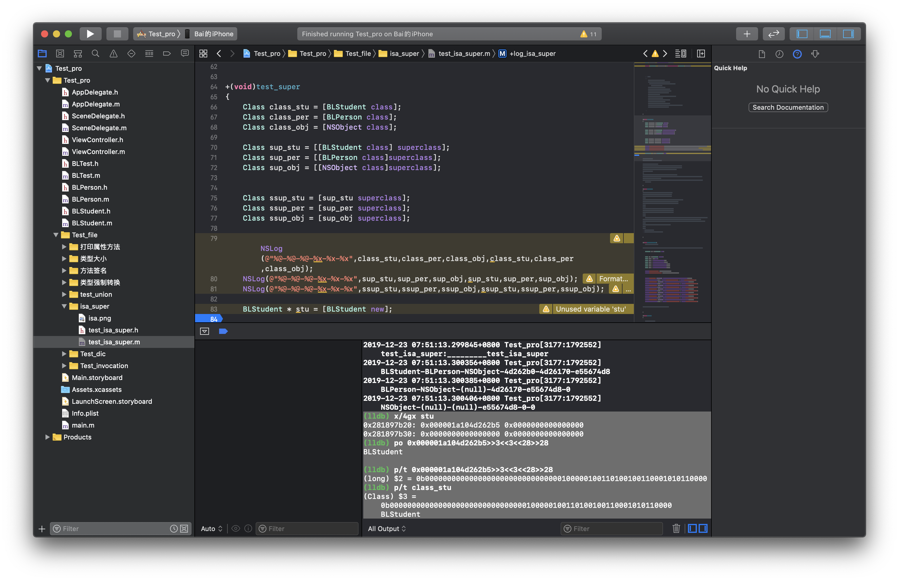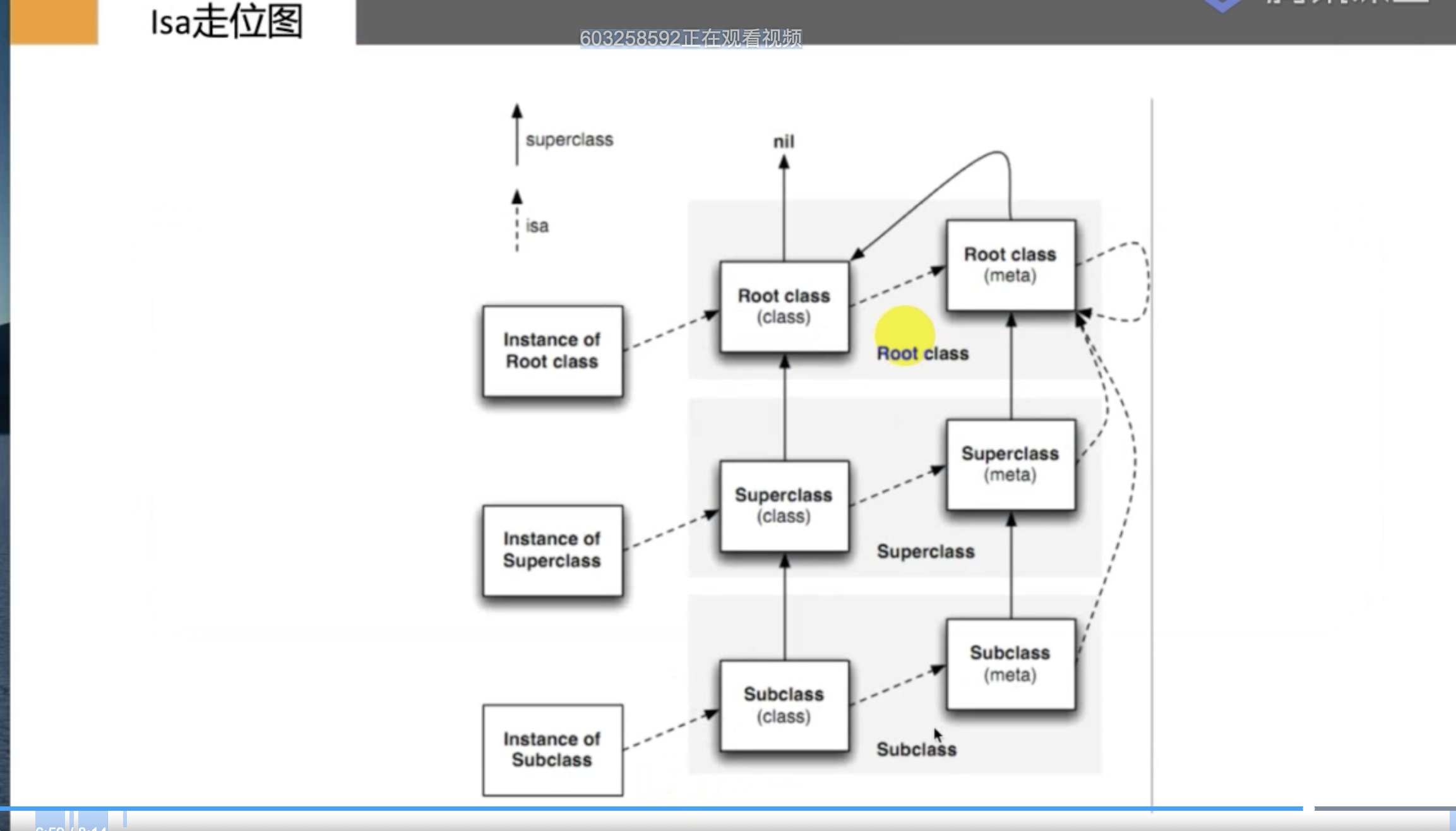 isa为实例内存第二个内存指针 实例 不包含super,使用isa 指向 class class->super 指向 superclass superclass->super 指向 superclass ... superclass->super 指向 nsobject nsobject->super 指向 nil
