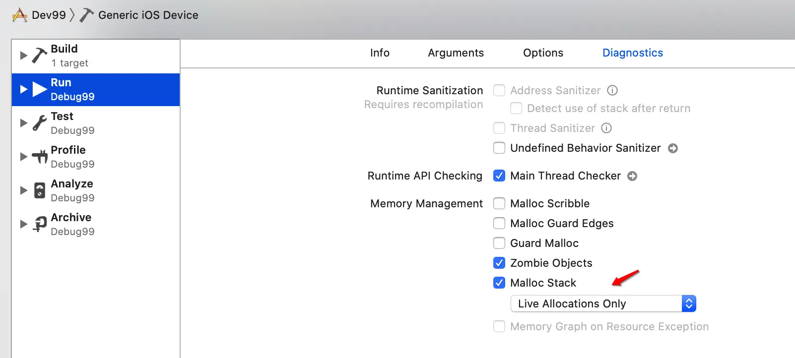Product -> Scheme -> Edit Scheme -> Diagnostics 中,开启 Malloc Stack 功能,建议使用 Live Allocations Only 选项