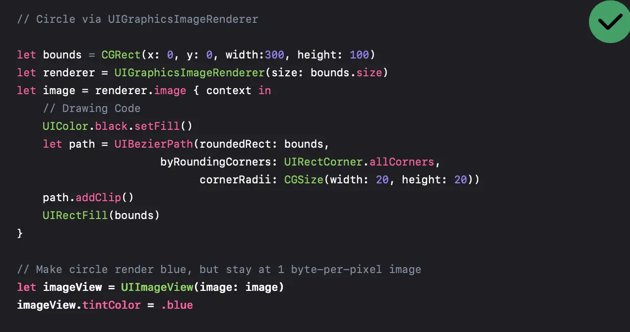 (1)这么多的格式,苹果 建议我们使用在 iOS 10 引入的 UIGraphicsImageRenderer 类替换UIGraphicsBeginImageContextWithOptions完成绘制任务,它在 iOS 12 中会根据场景自动选择最合适的渲染格式,更加合理地使用内存。(在使用UIGraphicsBeginImageContext和UIGraphicsEndImageContext时必须成双出现,不然会造成context泄漏。另外XCode的Analyze也能扫出这类问题)