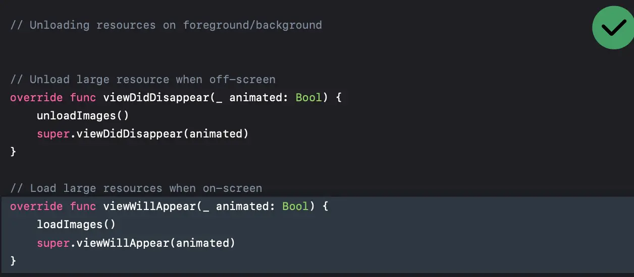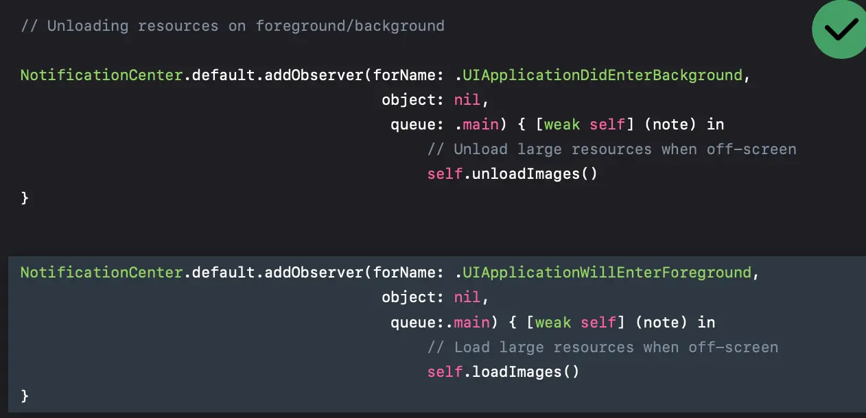 但 iOS 系统从 iOS 7 开始使用 Compressed memory技术,在内存紧张时能够将最近使用过的内存占用压缩至原有大小的一半以下,并且能够在需要时解压复用。它在节省内存的同时提高了系统的响应速度.本质上,Compressed memory 也是 Dirty memory.通常情况下,我们所说的减少内存占用是指 Dirty Memory 和 Compressed Memory。