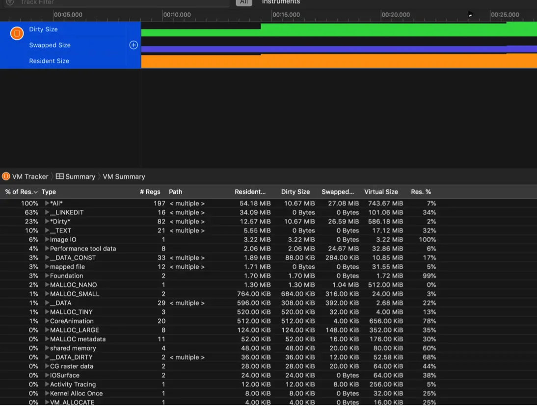 1.Clean -指的是能够被系统清理出内存且在需要时能重新加载的数据,包括 Memory mapped files、Frameworks 中的 __DATA__CONST 部分、应用的二进制可执行文件。