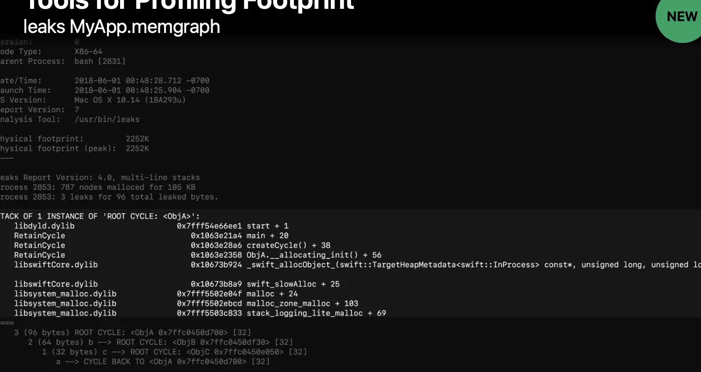 Xcode的Instruments为我们提供了一系列的工具来帮助我们debug。leaks可以帮我们检测出Leaked memory(无主内存),但在ARC时代更多的是循环引用导致的Abandoned memory,这部分可以用Allocations的 Mark Generation的方式来检测。还可以追踪程序的虚拟内存占用和堆信息,调用栈信息等。