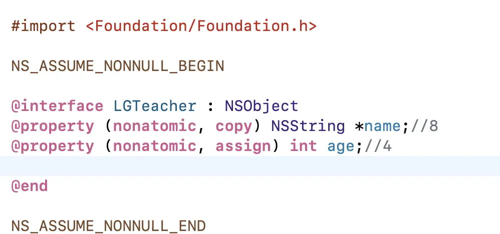2 第一个属性是以0的第一个位置为开端,此后每个属性成员的起始位置都要从本身大小的整数倍开始,例如:int 4字节,就要从4的整数倍开始存储,NSString为8字节,就要从8的整数倍开始存储