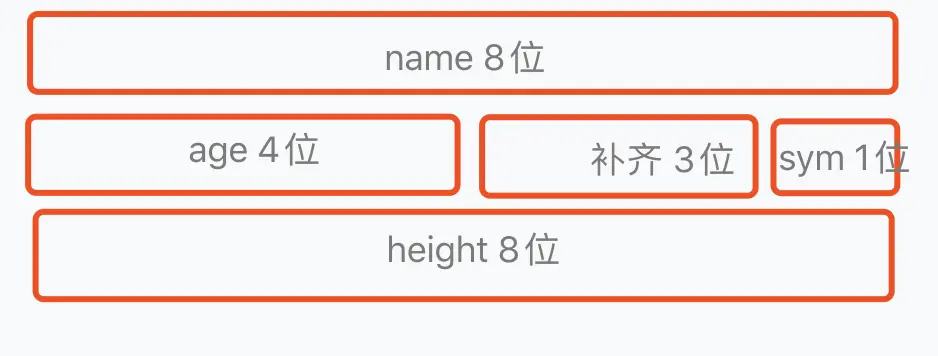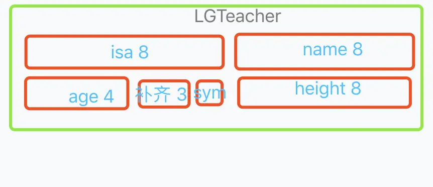 如果说属性成员比较多呢 举例:LGTeacher有成员: NString *name; Int age; char sym; long heiht; 那么他的对齐方式如图所示