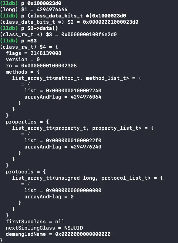 其中0x001d800100002389就是isa的地址,因为我们已经通过上面的计算得到了前三个元素所占用的内存,根据内存偏移,我们可以得到class_data_bits_t bits的地址为0x1000023b0 + 8 + 8 + 16 = 0x1000023b0,接着分析: