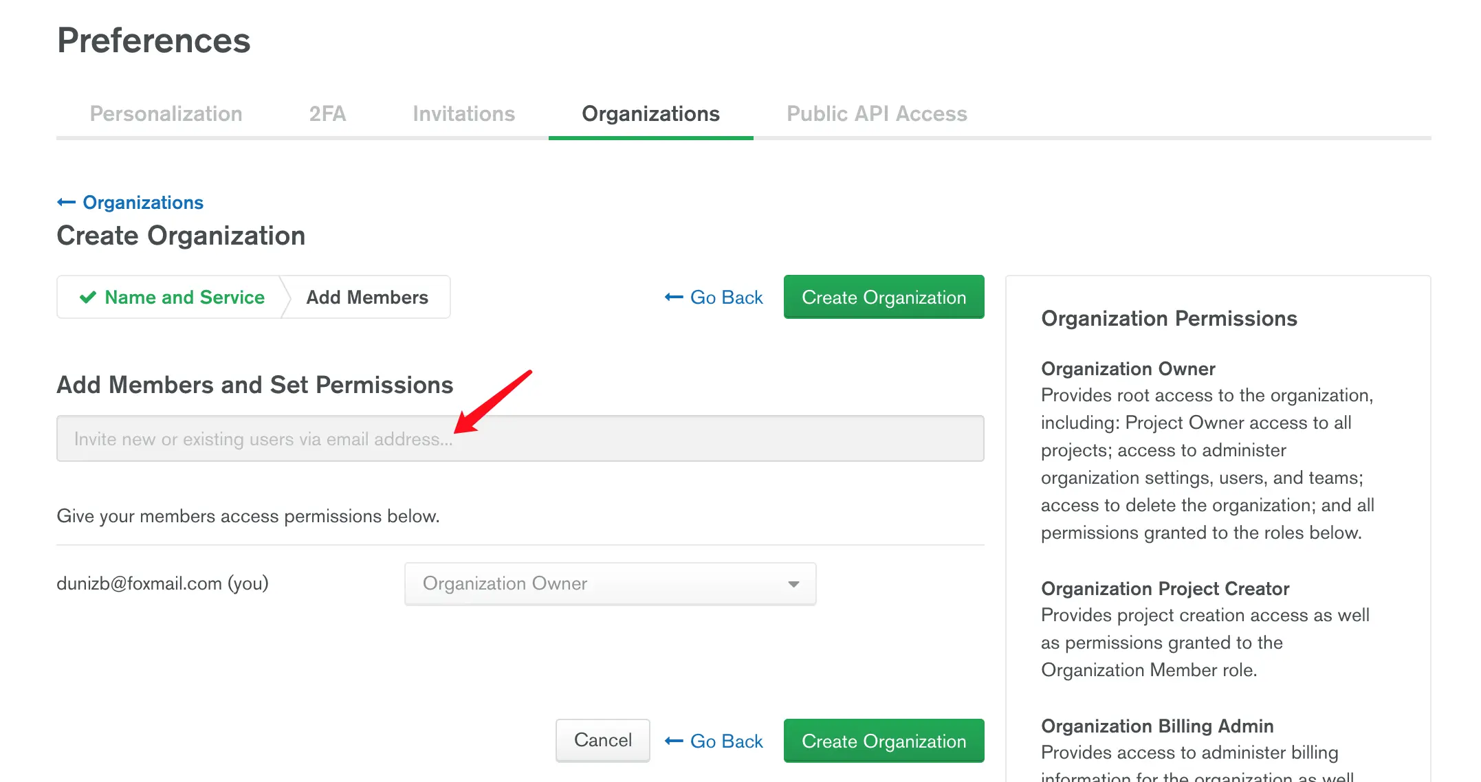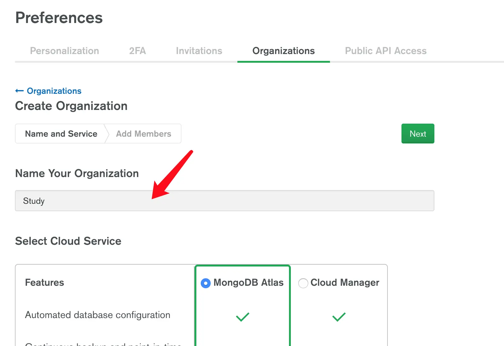 第1步,首先注册用户:www.mongodb.com/cloud/atlas…,创建后来到如下界面,填写组织名,云服务默认选择 MongoDB Atlas 即可。