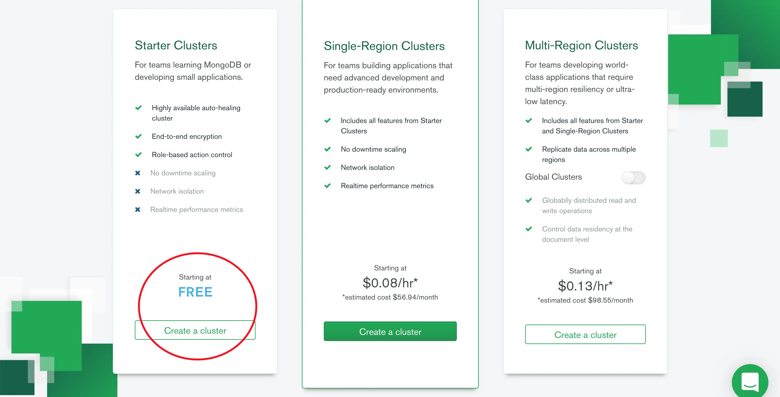 在国内,云大厂有阿里云、腾讯云等,但是都是收费的,而 MongoDB 官方也提供了 MongoDB Atlas,它有免费版和收费版,免费版就适合我们学习使用。