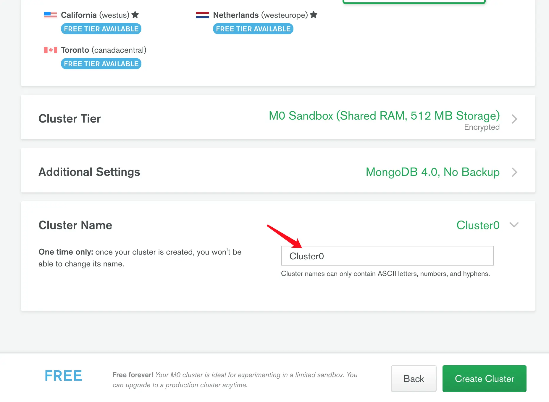 然后填写集群名称,如果不知道取什么名字那就默认为Cluster0吧,然后点击 Create Cluster 按钮