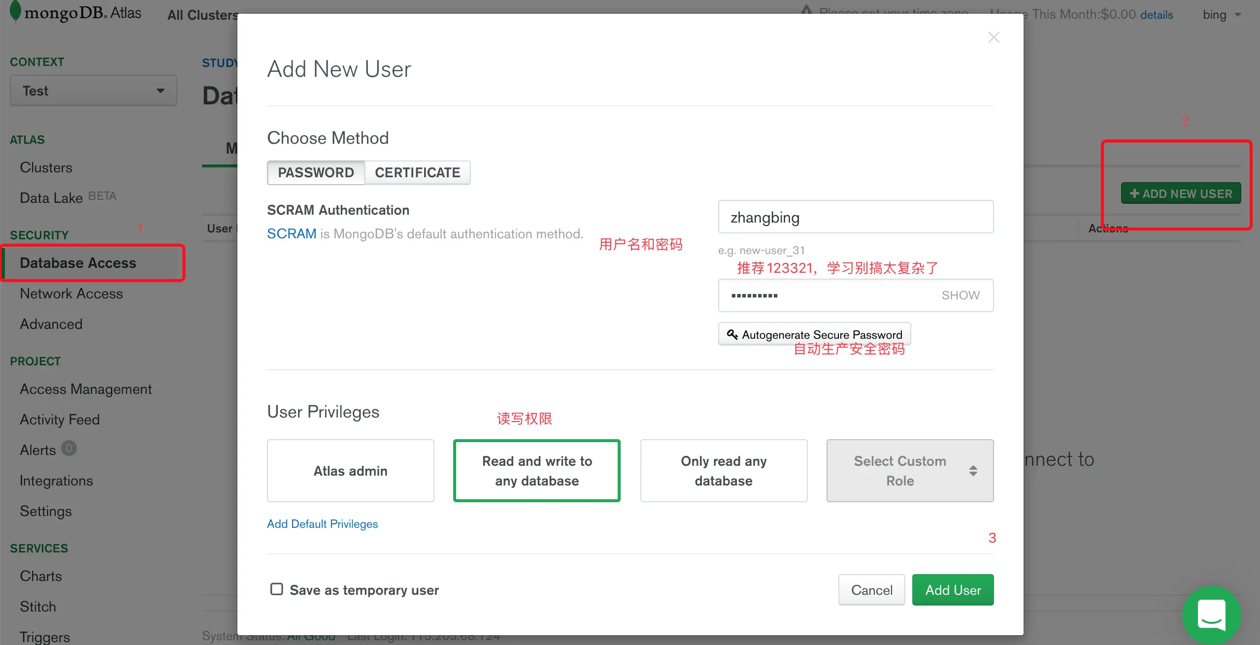 第1步,添加数据库用户,配置用户名密码,用于连接 MongoDB 时登录