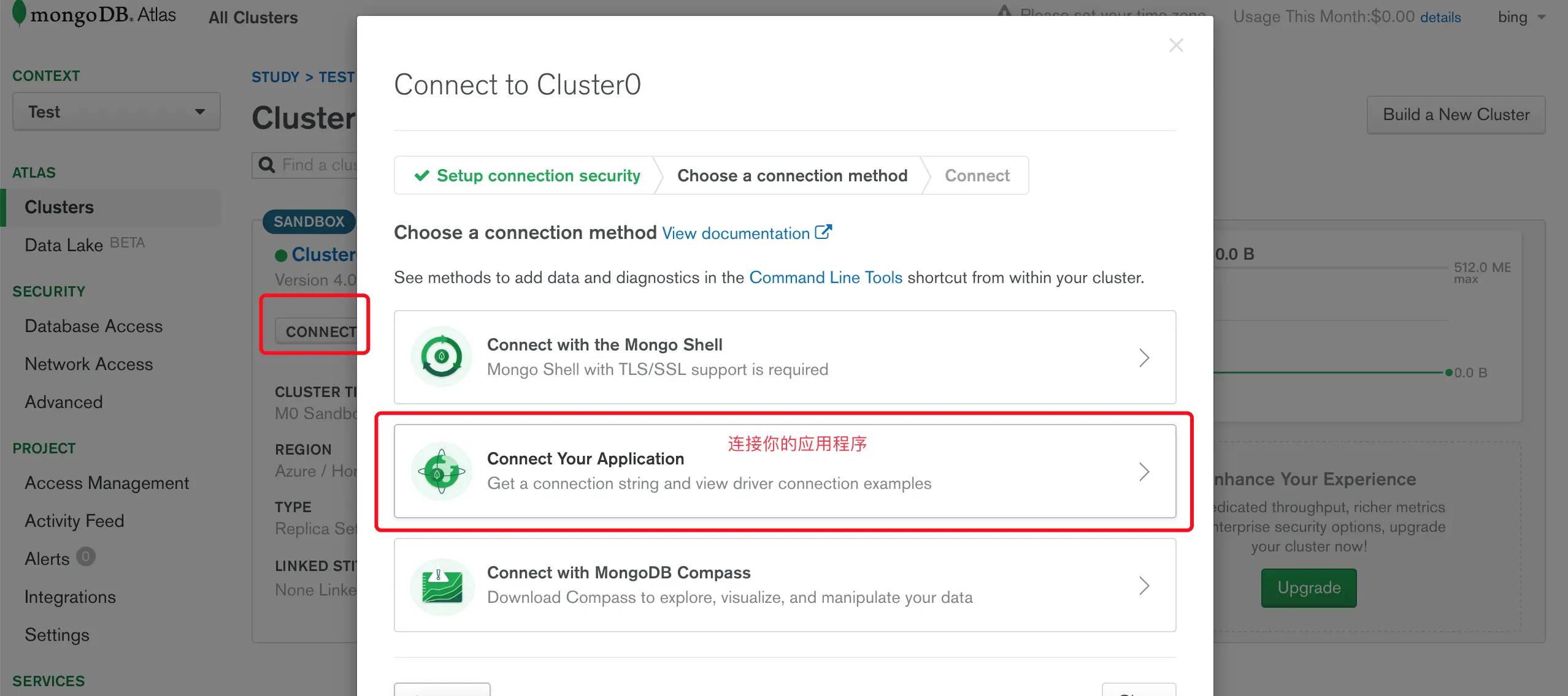 创建和配置好Atlas 集群后,我们就可以用 Mongoose 模块和 MongoDB 客户端工具进行连接了。