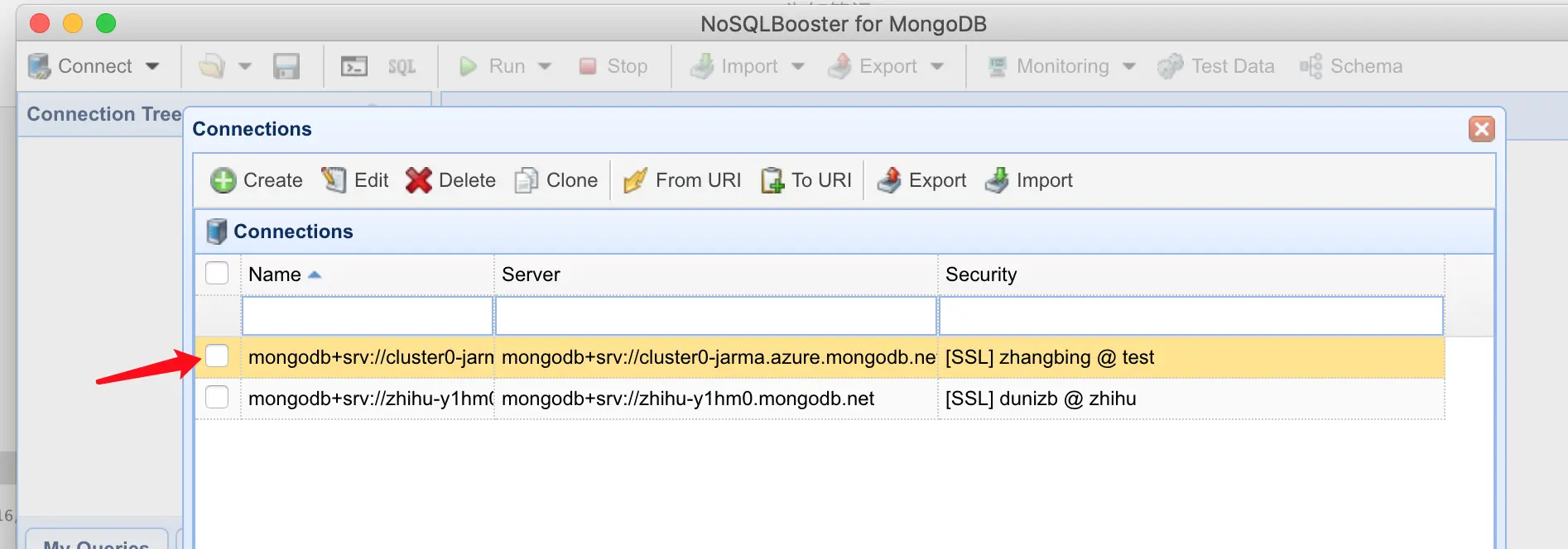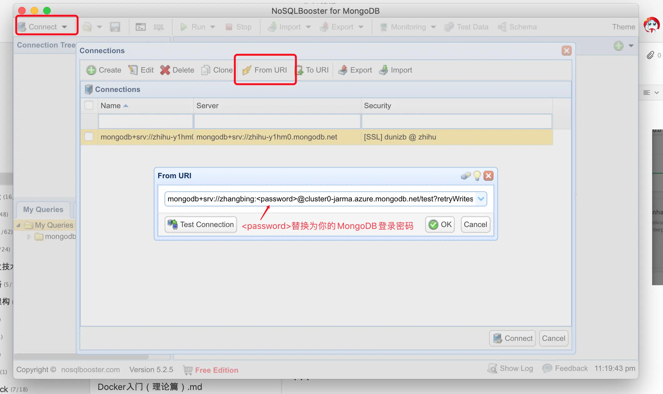 打开 NoSQLBooster 连接 MongoDB,选择 From URI,输入上面拿到的连接字符串,注意替换连接里面的<password>为你的 MongoDB 连接密码,比如123321。