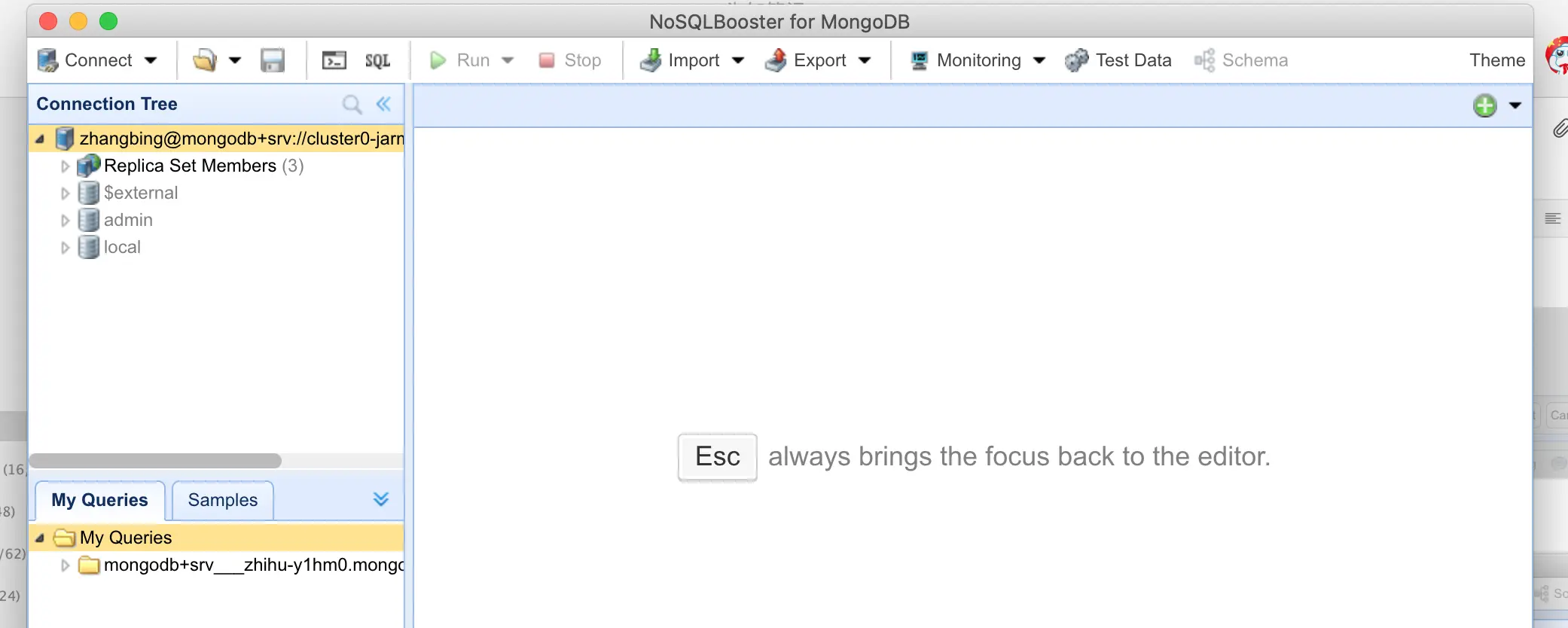 MongoDB 客户端工具有很多,免费好用的这里推荐 NoSQLBooster for MongoDB,支持Mac OS 和 Windows 系统,软件界面略有过时,由曾经风靡一时的 jQuery EasyUI 构建,界面美观程度还过得去。