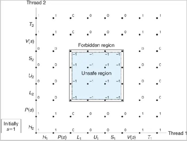 不穿过不安全区的轨迹都将正确的更新变量。为了保证程序的正确与逆行,我们必须锁住线程让他们拥有安全的轨迹(也就是不穿过不安全区)。一个经典的方式是信号量。