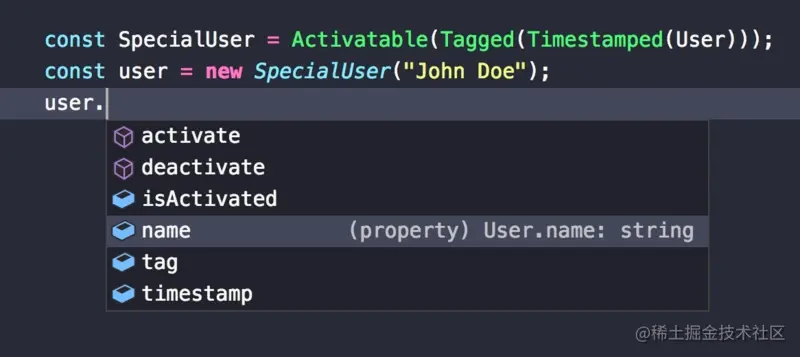 当然 SpecialUser类不一定非常有用,但关键是,TypeScript静态地理解这种mixin组合。编译器可以类型检查所有的使用,并在自动完成列表中建议可用的成员: