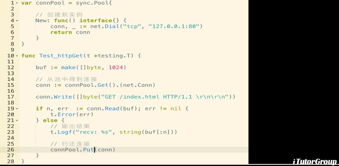 这个是我们1.13以后使用的Sync.Pool的例子,比如说我们有一个地方需要创建一个连接缓冲池,实际情况下大家不要这么用,http包里面自带的里面是有连接缓冲池的,上面的ConnPoolnew有方法。如果说Pool里面没有东西会调New,把连接创建出来,如果有的话就直接返回连接给调用方。底下的Test就是去连接池里面取coon,去调用请求,把得到的值打印出来把连接归还掉,比你每次都去New一个返回一个连接Dial好的多,这个是复用的,那什么时候回收呢?GC的时候会被回收的,所以也不用太考虑到你的连接是不是泄露掉或者是什么样的,这个只是举例的应用,实际大家不要这么用,自带的Golang的HPPT库里面是有的。