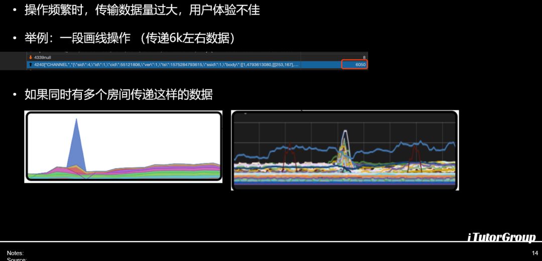 在GO技术上有一些分享,第一点分享我们面临的挑战是数据量大,我们一天就几万堂课,包括一些大会堂的广播这个数据量会非常大。如果我们有一些操作是比较重的话,比如说我们有一些画曲线,画很复杂的鼠标动的情况下面,原来是用json封装,大家都知道websocket一般是json做数据传递,这个是比较通行的办法。我们当初也是,我举个例子画线的会有6K的数据进行传递。如果是多个房间多个老师同时进行这样操作,很明显流量就往上飙了,这时你的血压可能也要往上飙了。