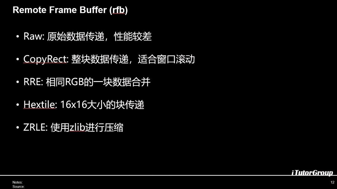 Hextile是RRE的升级版就是有一大块数据不好标会划成一小块一小块的16×16的大小,就不是纯色的RGB,就是文字里面有相同的地方,16×16这俩相同这个数据也可以进行压缩,最后一个ZRLE的方式,就是在前面的这种tell上面进行zlib的压缩,就是减少你的传递,提高整个的可用性和弱网情况下面的性能。
