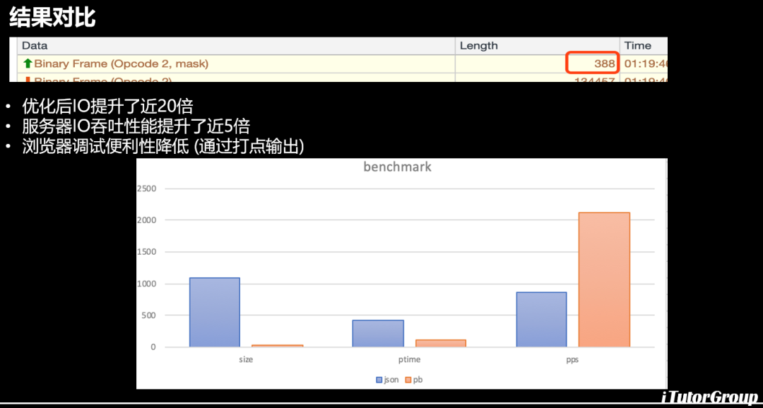 效果怎么样呢?是很明显的,刚刚600k的,我们直接压缩到了388个字节,IO提高了近20倍,服务器也提高了,为什么服务器也提高了?大家知道GO的json的序列化反序列化是有一些消耗的,你单个的json感觉不到,可能压力上来了上万个并发上十万个并发就感觉到json序列化反序列化消耗资源比较大,开源的库也是解决了这个痛点,我们用了pb以后整个序列化和反序列化的性能是好的,大家看图表上面第一个size是直接压缩的,ptime处理时间也进行了压缩,吞吐量我们用pb提高了近2倍的性能。用了pbjs以后唯一不好了就是调试上面比较坑,你必须通过你在前端埋点进行输出,不像原来直接打开开发者工具直接可以看到你传递的json和返回的json,必须通过埋点进行调试。