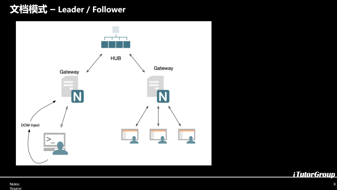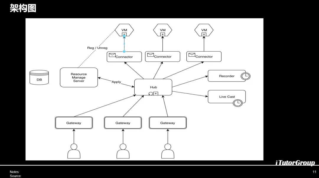 所有的请求会集中到HUB上面,HUB进行协议的转发和流的控制,在connector渲染出来的通道会有一个旁路的录像方便客户回看.还有一个是服务于大讲堂的推流模块,比如说上千人,上万人大会堂的模式会做RTMP的回流,在讲堂里面把你操作的东西分享出去,这样就形成了远近场,我们看到Gateway连的是近场的所有的老师操作是实时的,远场看的是视频。