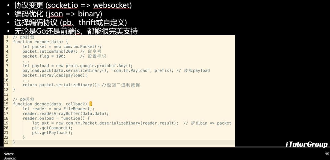 解决办法:我们原来用的io是基于socket之上的,后来换成websocket,我们把json换成binary,大家知道socketio不是传二进制设计的,而且base64远远不如二进制的更优秀。前端的js功能,已经可以解码二进制的位操作了,也可以custom你私有协议的解码和编码,当然我们出于扩展的考虑,更多希望用成熟的框架,比如说pb、thrift这种成熟的框架,这个在前端的js使用上面也是毫无压力很完美。