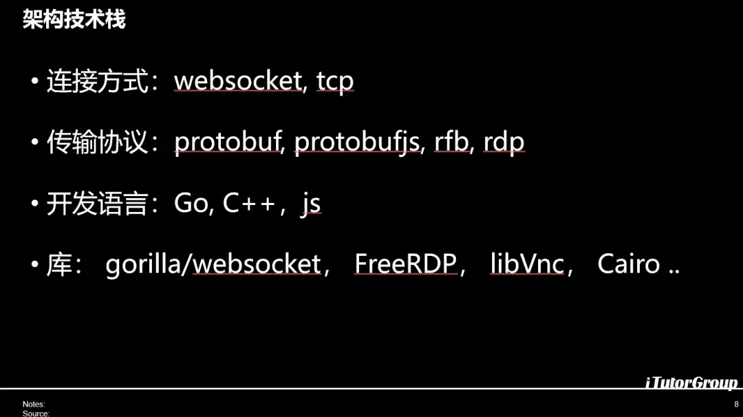 我现在分享一下我们在上面的一些实现,讲一下我们的技术栈,是通过websocket,服务器的后端都是通过Tcp,传输协议有protobuf和fjs,还有rfb、rdp是远端桌面协议,这个是我们处理的协议,开发语言是GO,主要是GO然后一些关键的地方是用的C++,前端是用的js,依赖的库有websocket,Freerdp,libvnc还有cairo的库。