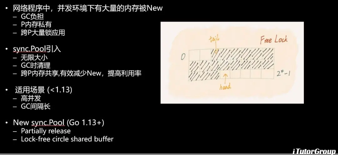 我下一个分享的点是关于内存使用的,也是一个性能上面的优化,大家知道在我们写大量的网络程序的时候是有很多的内存是被New出来的,比如说Golang里面有很多的,大量的被New出来以后被回收带来一些GC的负担,你自己写一个缓冲区做读写是没有问题的,但是你要考虑到跨P,大家知道Golang的GMP的模型跨P的内存的共享,如果你要跨P有大量的锁,比如说这个P在读取你内存的时候锁起来,然后写入的时候锁起来,等写完了以后放开让其他的Goroutine进行访问。