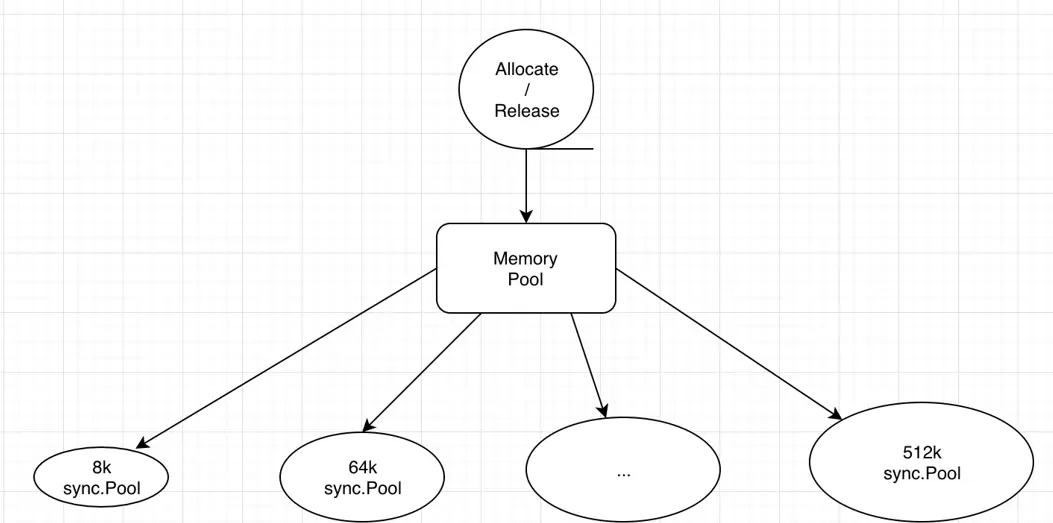 解决办法:我们改进的方式就是引入了一个sync.pool的组,什么意思呢?我把你的内存的池画成了不同大小的slod,8K一个,16K一个,64K一个,到前面的分配字节的时候根据我要的字节的大小落到什么区间内就分配合理的sync.pool,使用完再归还给他,下次被其他的Goroutine复用,这样就有效减少了GC的时间,提高了整个程序的性能。