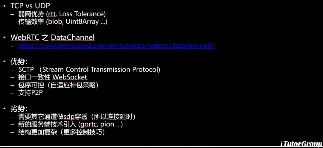 我们实验的就是DataChannel,我们的网页端除了WebRTC进行传递我们还用DataChannel传递,下面是连接,大家有兴趣可以看一下,优势就是在于不但是传递了数据还有反馈,比如说他有一个SCTP的就是流控协议,你可以根据这个协议看到你的这条连接的丢包情况,RTT还有传输的阅点,还有质量。第二个是接口一致性和websocket一致的,编码上面可以很平滑的做切换,第三个是包序可控,DataChannel是可以控制的,不控制包序传输效率会有提升。第四个是支持P2P不需要服务器就可以直接进行DataChannel的数据的传递。