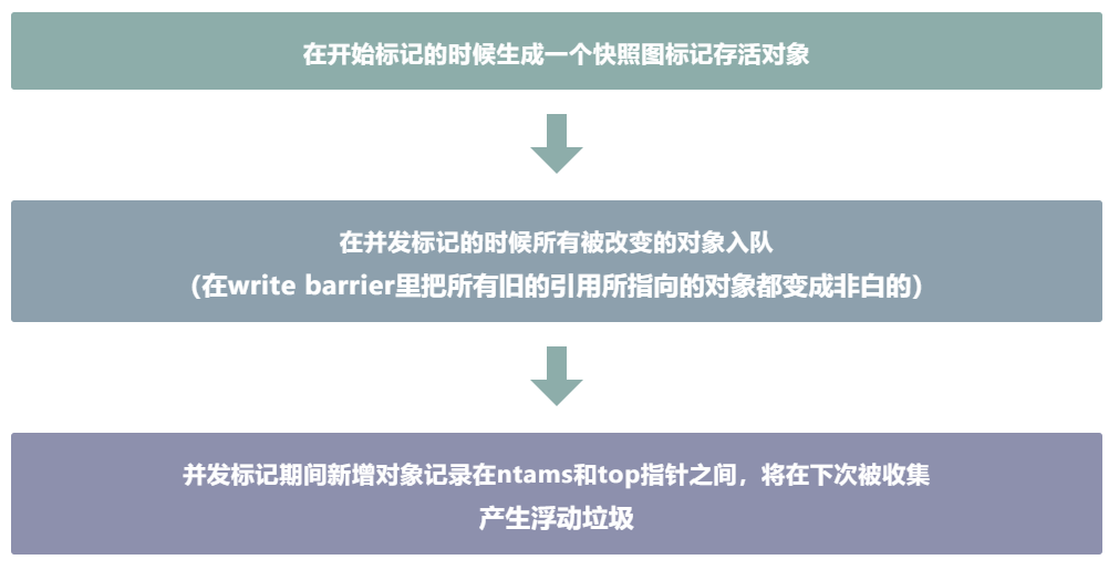 [Bottom, NextTAMS)-> 当清理时,PrevTAMS指向NextTAMS地址,NextTAMS归零,所有垃圾对象能通过[ Bottom, previousTAMS ]之间的对象快照被识别出来;