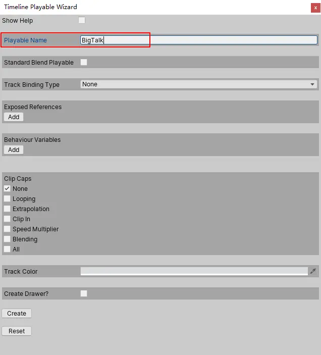 这里面最重要的就是需要填上第二个属性:Playable Name,这个名字就是轨道、clip、PlayableBehaviour等的前缀名字。